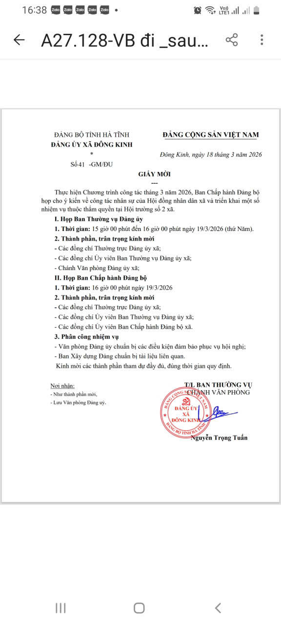 14h:00 | Tham dự Đại hội Hội Liên hiệp Thanh niên xã NK 2026 - 2029 | Chủ tịch, các PCT UBND xã | HT số 1 | Xem GM | | Chủ nhật 22/3 | 14h:00 | Dự lễ kỷ niệm 60 năm thành lập Trường THPT Lý Tự Trọng | Chủ tịch, các PCT UBND xã | | |